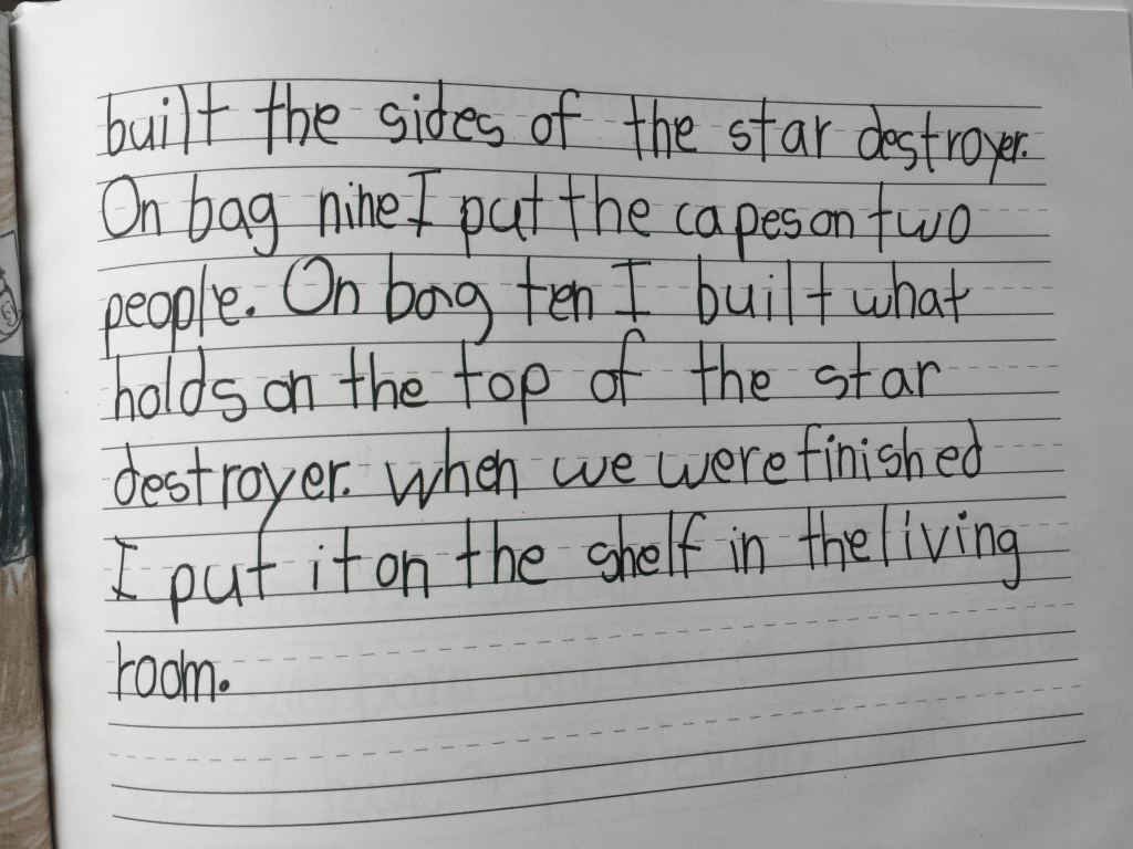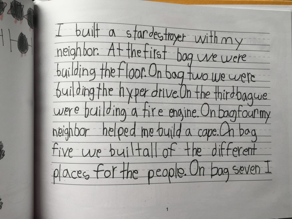 The facts are my son was incapable at the time of generating the above. He could verbally tell the story, but he didn’t write this onto paper. It wasn’t possible, and I know this because right after this book published we found out he thought the alphabet was just a song, and he had no idea that the shapes had sounds that correlated to what he was seeing on the pages of the books he was being forced to “read” every night. Also, a 1st grader, at this point in the year as well, should have better handwriting, assuming that handwriting instruction is actually being taught, but again it wasn’t. What was being taught that year and every year since was Lucy Calkins’ Writing Workshop.
